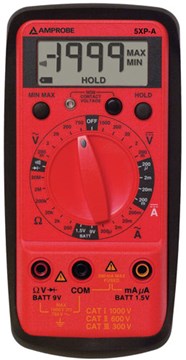 Amprobe 5XP-Một vạn năng kỹ thuật số nhỏ gọn bao gồm tất cả các tính năng và chức năng cần thiết cho một loạt các ứng dụng. Đồng hồ đo điện áp xoay chiều đến 750 V, điện áp DC đến dòng điện 1000 V, AC và DC đến 200 mA, và điện trở đến 20 MΩ. Các phép đo được hiển thị trên màn hình LCD 3-1 / 2 chữ số. Đồng hồ vạn năng cũng bao gồm các tính năng độc đáo như phát hiện điện áp không tiếp xúc VolTect và kiểm tra tải pin với khả năng 1,5 V và 9 V. Ngoài ra, đồng hồ có tiếng bíp liên tục, kiểm tra diode và bảo vệ quá tải. Một chỉ báo điện áp không tiếp xúc cảm nhận điện áp từ 70 đến 600 VAC.